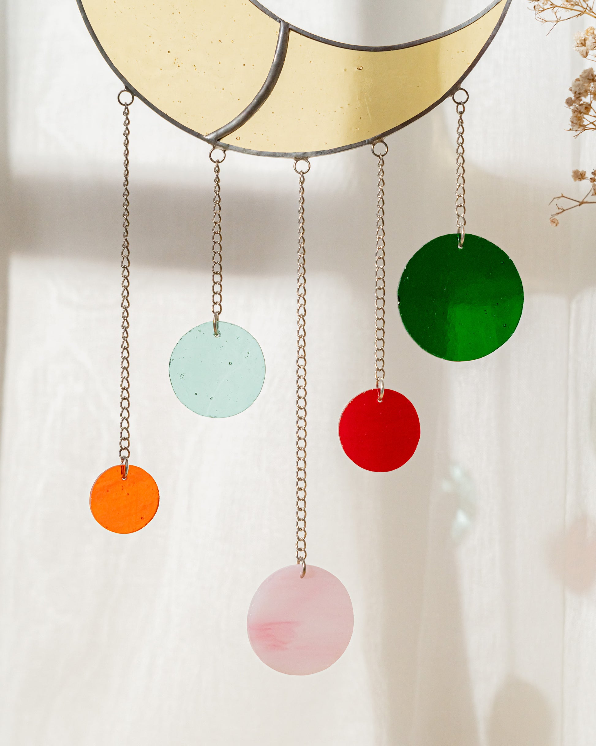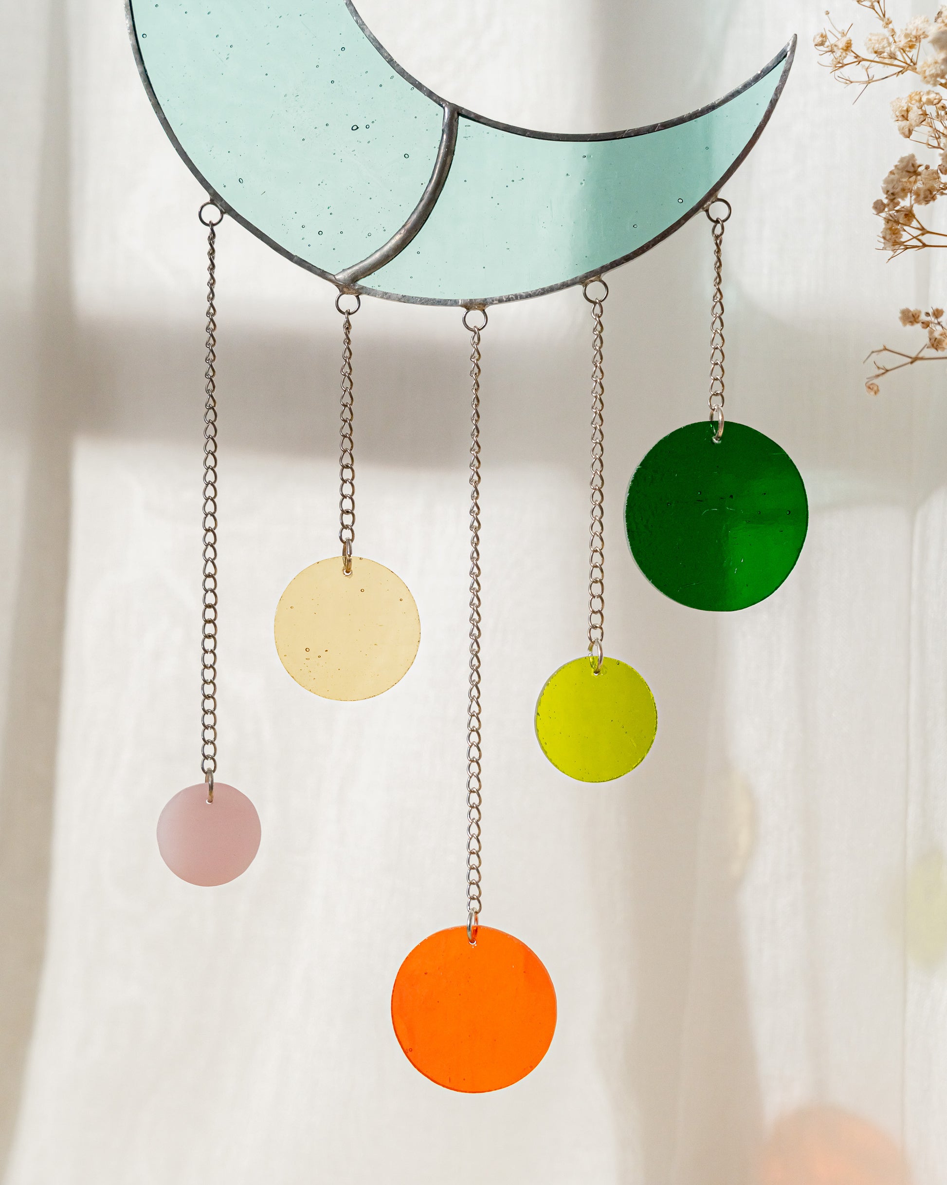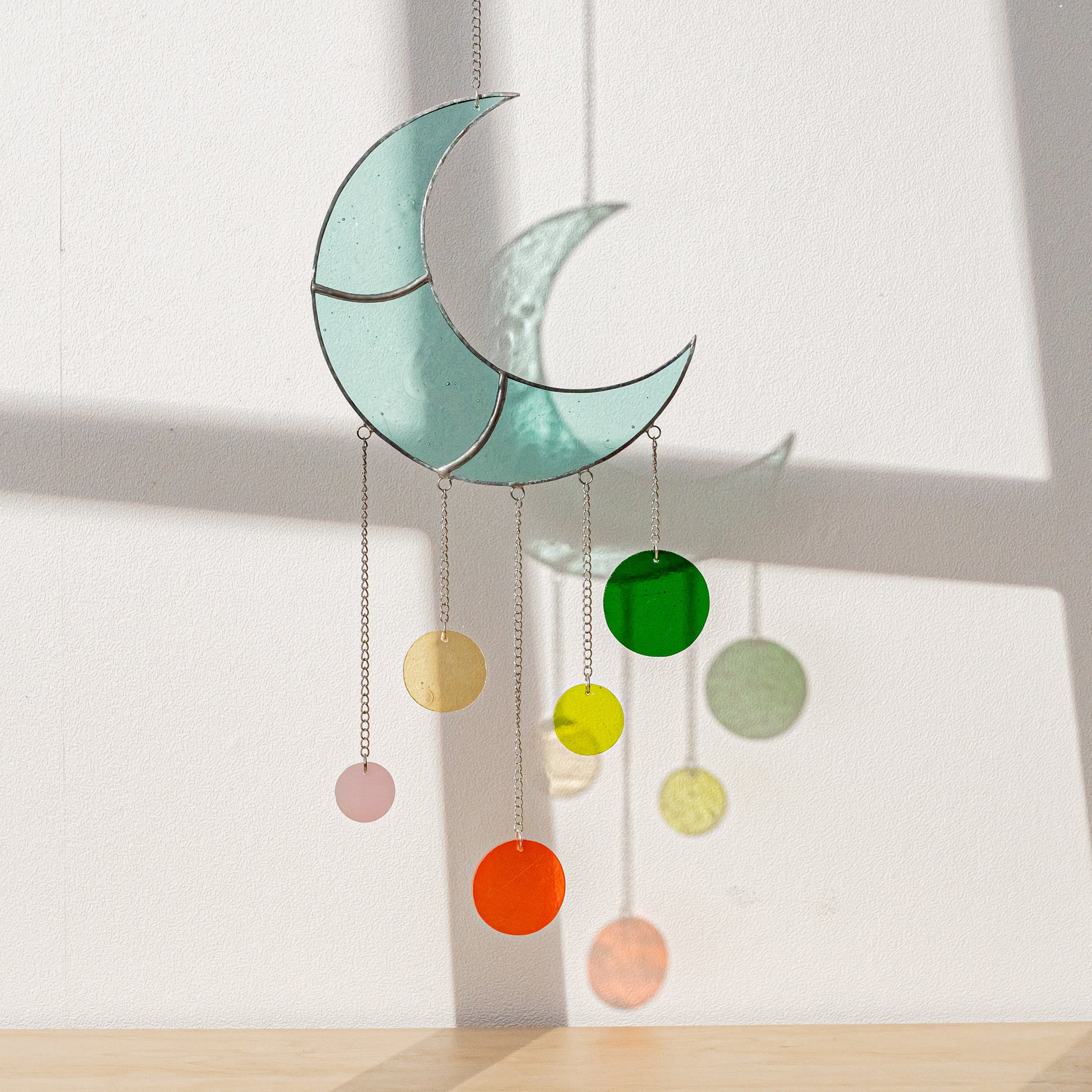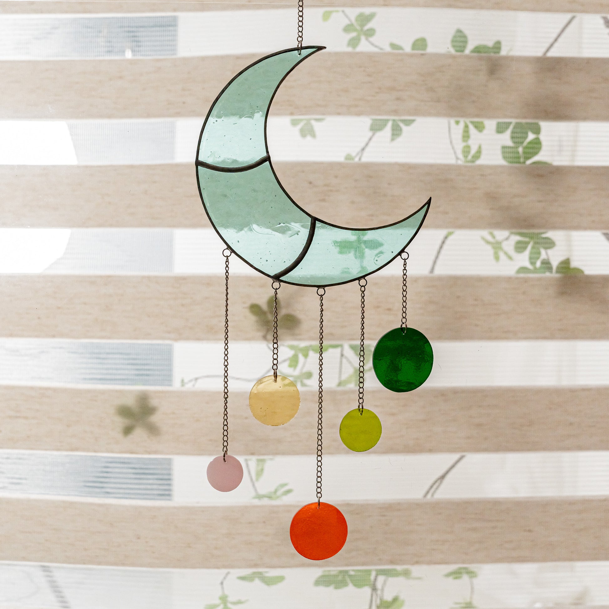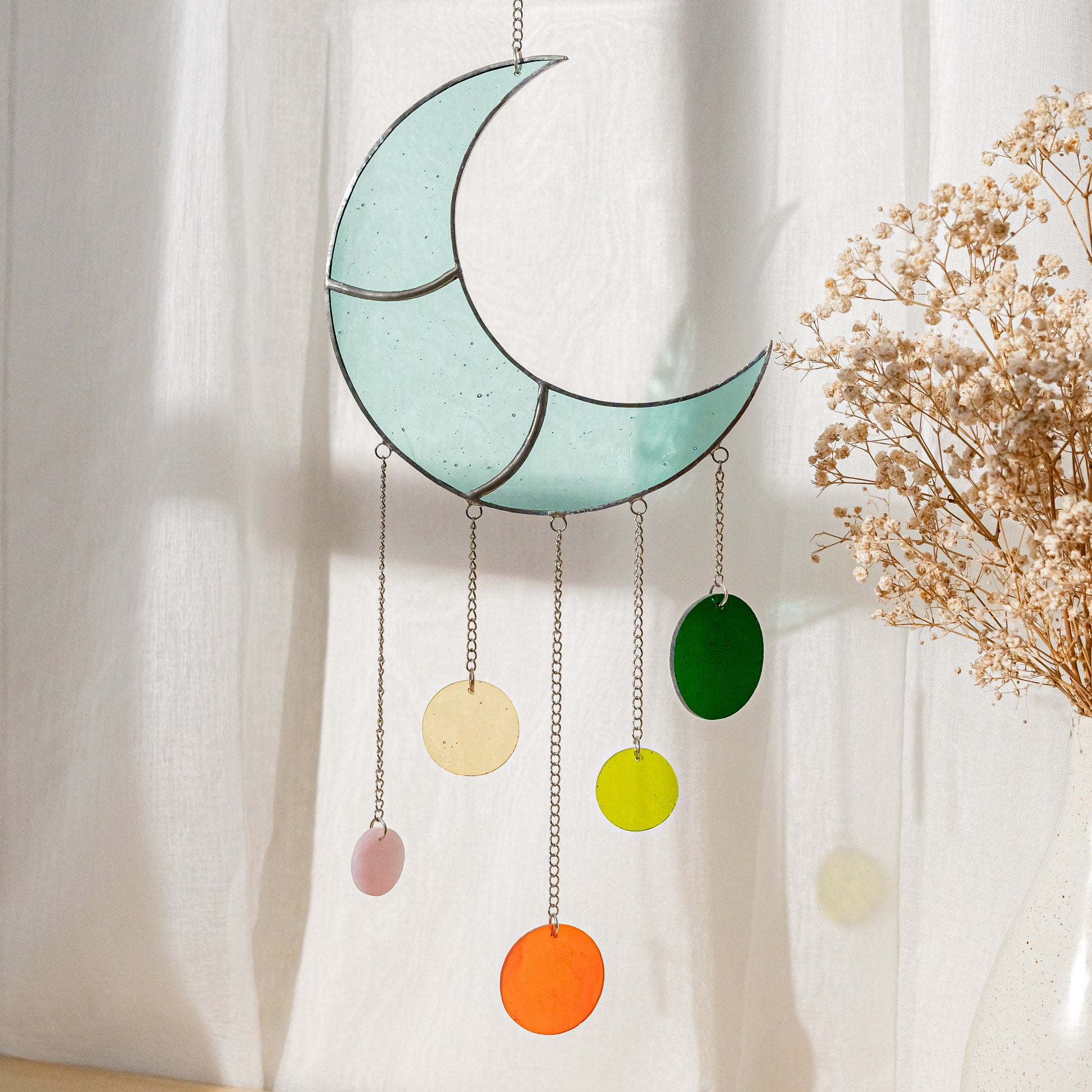 These Moon Phase Stained Glass Wind Chimes Suncatcher are 100% handcrafted with Glass.